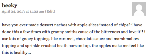 Becky! Who gave a great suggestion for apple styled nachos… sign me up! Shoot me your address to foodosaurusrex [at] gmail [dot] com, and I’ll have chips on their way to you!