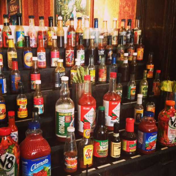 On Sunday morning after the race, Ashley and I headed to The Mad Hatter for brunch. We walked in and the restaurant was basically empty, but we were told that they really didn’t have any seats for us because they had a lot of reservations that morning. Huh? We were able to score a seat at an upstairs bar, and got to work on the most important thing – booze! I ordered a mimosa followed by a beer, and Ashley hit up their Bloody Mary bar. That’s right… your server gives you a glass of vodka, and the rest is up to you. Just look at all the options!