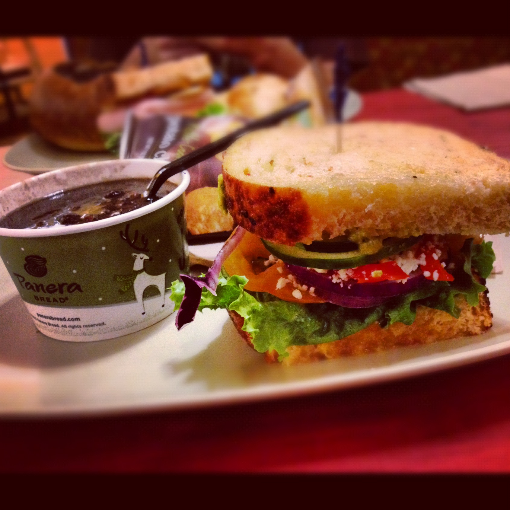 I paired the soup with their Mediterranean veggie sandwich (I had to go with the “You Pick Two!”), and it was a completely satisfying and delicious meal. It was just the push I needed to make my visits to Panera more frequent. I’m hooked on that black bean soup! And, the veggie sandwich was just the right amount of crisp vegetables, dressing, and feta cheese. And besides, who doesn’t love soup in a sourdough bread bowl? I can’t wait to head back to try out more soup – their creamy tomato soup and new grilled cheese is calling my name!